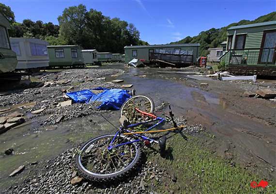 Police said four campsites along the River Leri were evacuated as the floodwaters rose. In Talybont, about 115 miles (185 kilometers) from the Welsh capital, Cardiff, water surged through the village, forcing some people to be rescued by helicopter.