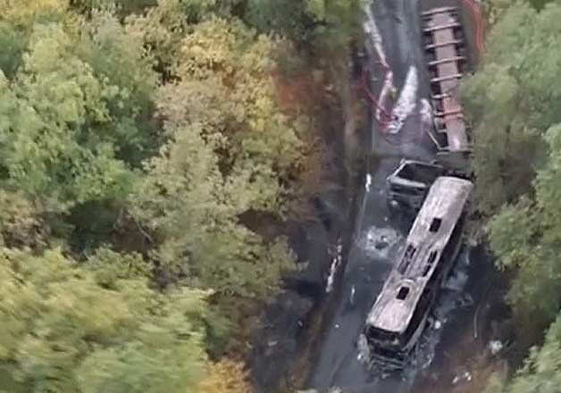 Police said the death toll was unusually high because both vehicles caught fire immediately. Scores of emergency workers rushed to the scene, and helicopters evacuated severely burned victims.