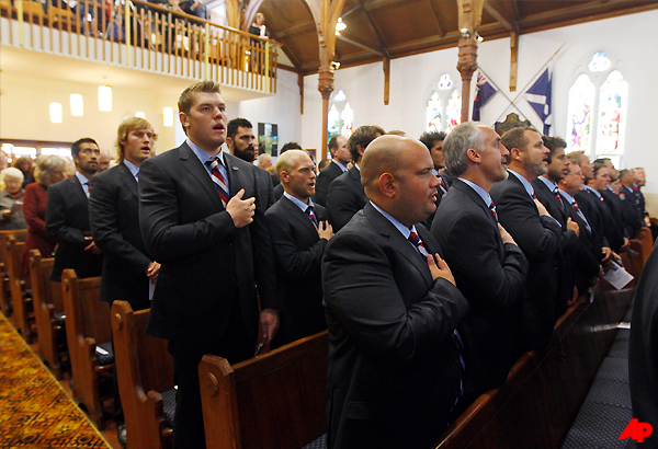 Players from the American Eagles rugby team joined hundreds of others Sunday morning at a memorial service in the town of New Plymouth, New Zealand. The team is in the country to play in the Rugby World Cup tournament. U.S. ambassador David Huebner also attended the service at St. Andrews church.