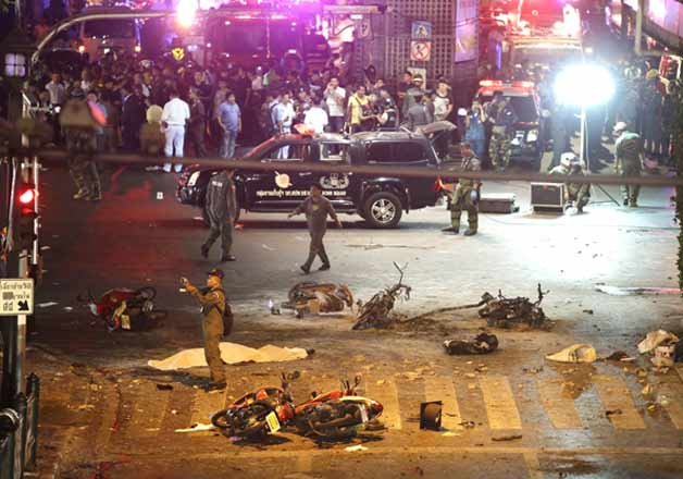 Police said first an improvised explosive device fastened to a utility pole in front of the temple at the Ratchaprasong intersection detonated which was immediately followed by a motorbike bomb blast, causing two nearby taxis to explode.