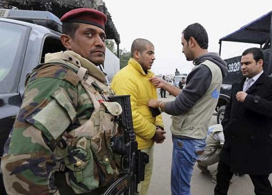 Flanked by armed military officers, they were taken to locations in Baghdad where they carried out the attacks last month. Convicted bomber Haider Ali Motar wails as a man in a wheelchair spits verbal abuse towards him.