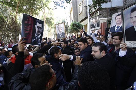 At least 200 people immediately rallied in a square outside the mosque, chanting support for President Bashar al-Assad and waving Syrian flags. Some carried portraits of his late father and predecessor Hafez al-Assad.