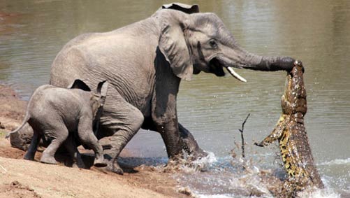 A protective elephant mum got the shock of her life when her trunk was caught in the jaws of a ferocious crocodile in an epic tug of war in Zambia, reports Daily Mail. The female elephant and her baby were drinking from the Luangwa River in the South Luangwa National Park when they were attacked.