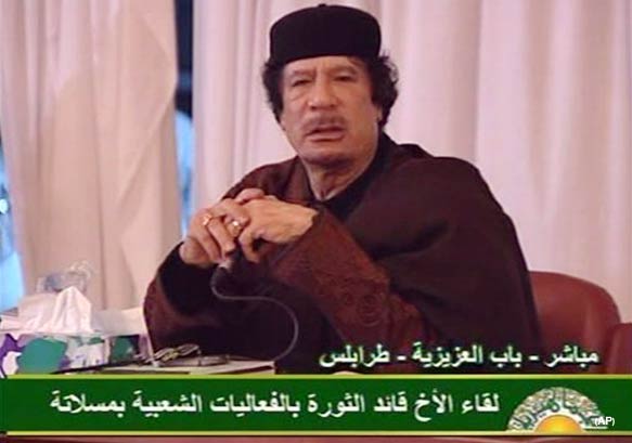68-year-old Gaddafi yesterday attacked Britain as well for calling for a no-fly zone. "What right do you have? Do we share borders? Are you our tutor?" he asked.