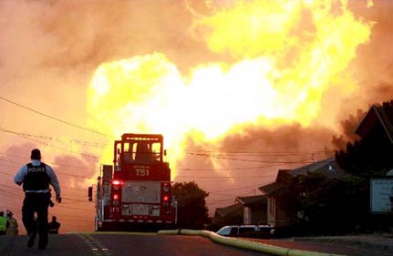 A ruptured gas pipeline is believed to have caused the flare-up in San Bruno, which has already consumed between 35 to 45 houses, with flames reaching as high as 18 metres into the air.