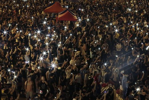“Democracy now! Democracy in Hong Kong!” thousands chanted as speakers from the movement seeking wider political reforms for this former British colony urged them to persist in their campaign. The rally lasted hours, with participants at times clapping and cheering as a stream of speakers and singers addressed them and performed popular songs.