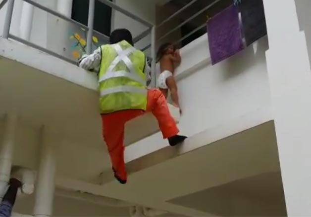 Shammugun climbed up to a second floor unit to support the three-year-old girl whose head was trapped in between the rails of an external clothes drying rack outside the service yard.