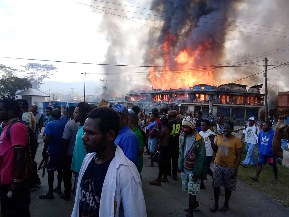 Television video showed orange flames and black smoke billowing from burning buildings in Wamena.