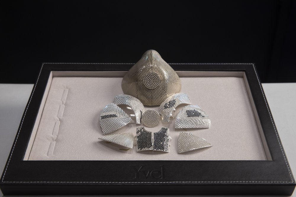 In an interview at his factory near Jerusalem, Levy showed off several pieces of the mask, covered in diamonds. One gold plate had a hole for the filter.