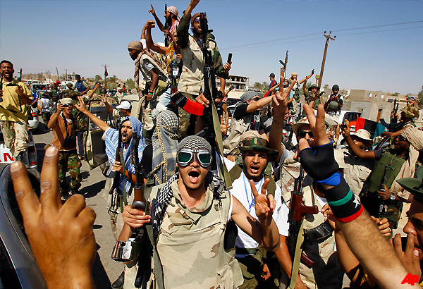 Shouting the war cry “Allahu Akbar!”, “Allah is greater” -and “Hold your heads high, you are Libyans!” the fighters drove into the town—site of steady fighting over the past two days—pushing Gaddafi's diehards back towards Sirte, some 30 kilometres (20 miles) to the west yesterday.