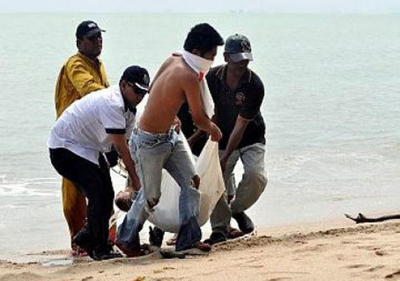 The Malaysian marine police retrieved the bodies from the water off Johor state's Bandar Penawar town.