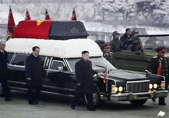 Jong-Un, dressed in black and gloveless despite the cold, held the side of his father's hearse, accompanied by his influential uncle Jang Song-Thaek and other officials.