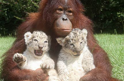 An Orangutan Hanama is playing mum to a couple of cuddly lion cubs.The giant ape lay on her back with one on her tum - and then hugged the pair.