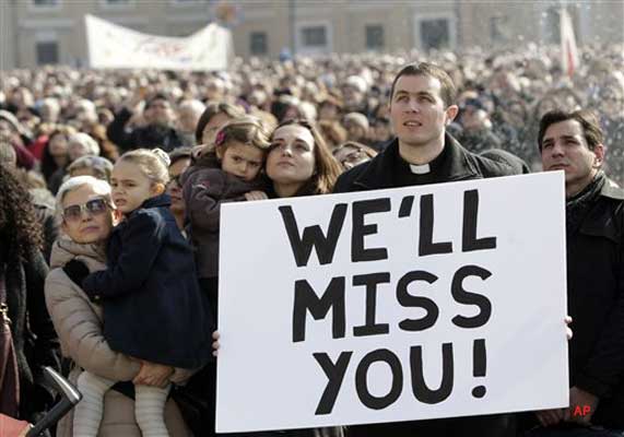 Those who arrived hours before the pope appeared could enter the square with ease for a chance to join in the show of support for him. "We wanted to wish him well," said Amy Champion, a tourist from Wales. "It takes a lot of guts to take the job and even more guts ... to quit."