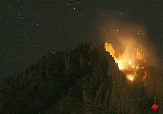 Authorities started getting calls reporting a mushroom-like explosion near a mountain peak 40 miles (64 kilometers) east of downtown Phoenix on Wednesday evening. Flames could still be seen hours after the crash.