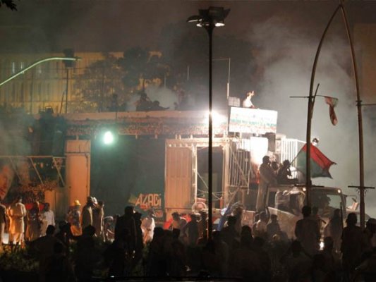 The move came after Imran Khan and moderate cleric Tahir-ul Qadri's supporters were baton-charged outside the Prime Minister's official residence in Islamabad. One woman was killed in police firing and over 350 others were injured.