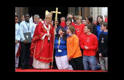 Benedict confronted the abuse scandal head-on during his homily, a day after six people were arrested in an alleged terrorist plot against him. They remained in custody Saturday.
