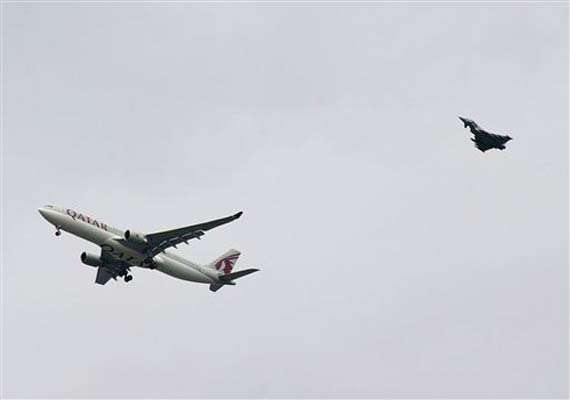 London: A British fighter jet was today scrambled to escort a Qatar Airways plane carrying 282 people to Manchester airport after reports of a possible device on the aircraft emerged, as police arrested a passenger on suspicion of making a hoax bomb threat. The Qatar Airways plane was escorted in to land by the Royal Air Force (RAF) following information received by the pilot.