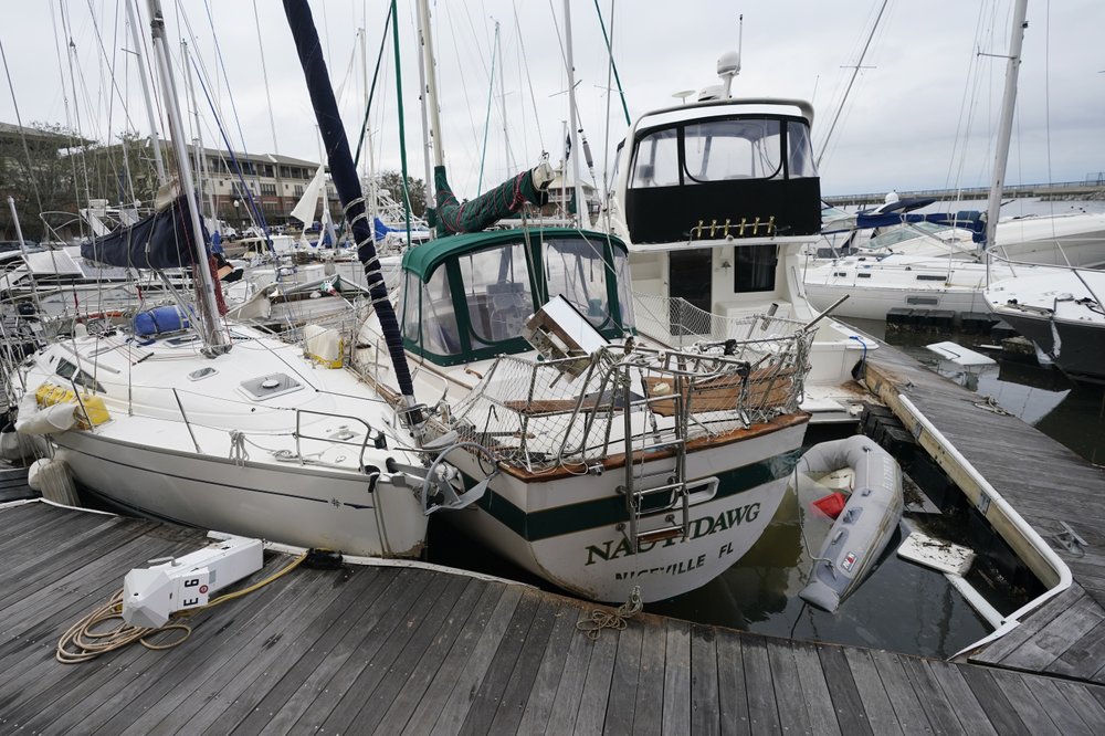 At a downtown marina, at least 30 sailboats, fishing boats and other vessels were clumped together in a mass of fiberglass hulls and broken docks. Some boats rested atop sunken ones.