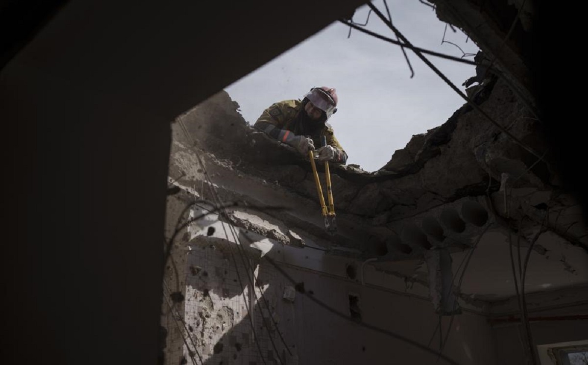 Firefighters work to secure a residential building previously damaged by a Russian attack in Kharkiv