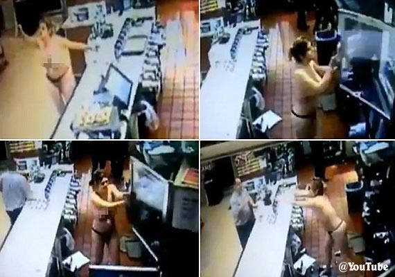 New Delhi: In a shocking security camera footage shows a crazed topless woman in just her panties tearing apart a McDonald's in Florida.