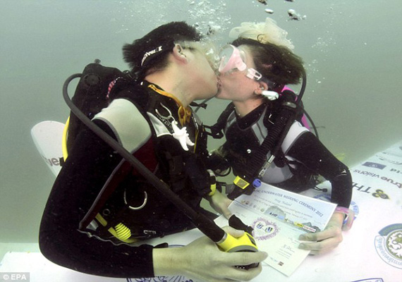 A second couple from Thailand, Manit Kansadanpipob and his bride Nachakul Sirityoungkul were photographed removing their mouthpieces briefly for their first kiss as man and wife at the underwater alter south of Bangkok.