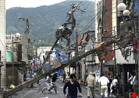 NHK footage showed rows of houses that had lost roofs, apartment complexes with smashed balconies and shattered windows, and crooked telephone poles that could barely stand. NHK also showed footage of a swirling gray cloud it said was taken by a passer-by.