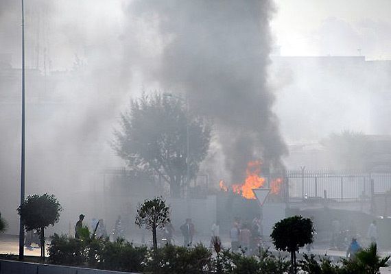 The embassy building itself -- a fort-like structure -- was untouched, but a gym and parking lot within the compound were ransacked and set alight. The windows of the small building at the complex's entrance used to screen visitors were smashed and computers stolen.