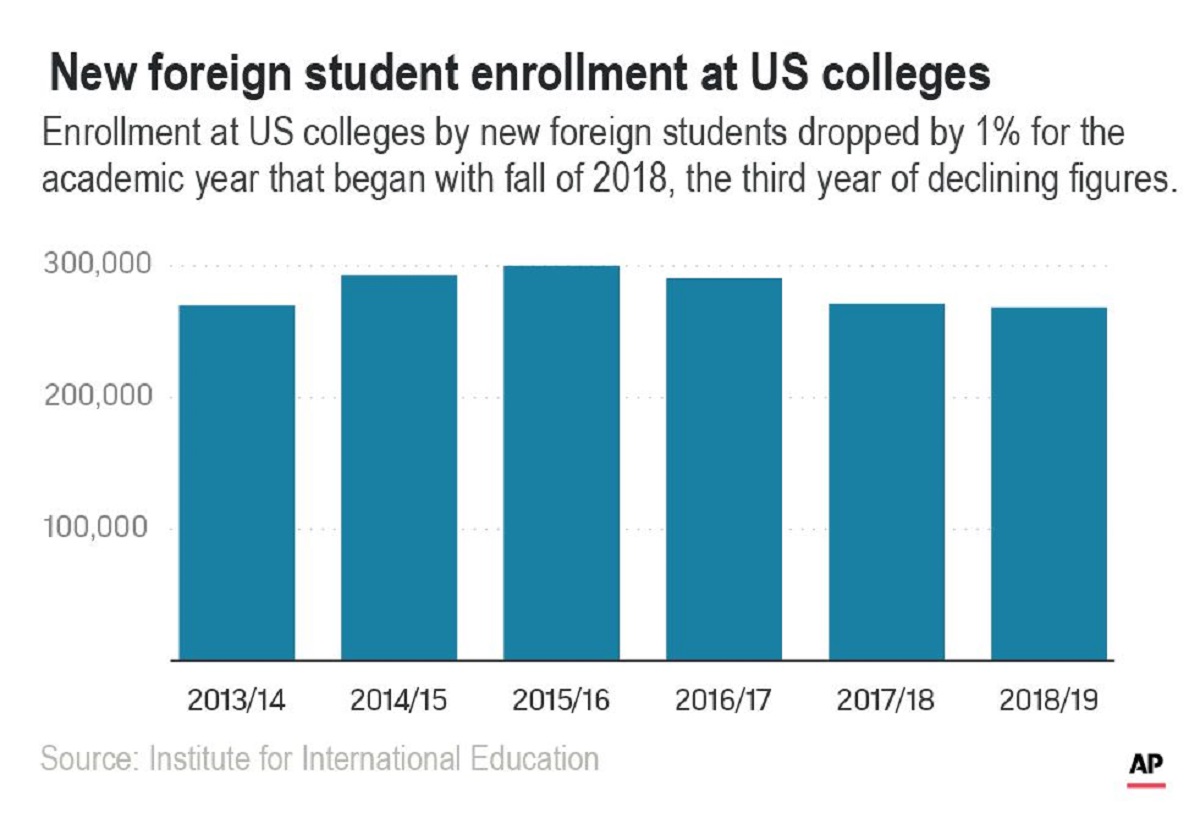 An annual report from the Institute of International Education found that the number of newly enrolled international students dipped by 1% in fall 2018 compared to the year before. It follows decreases of 7% and 3% in the previous two years, which were the first downturns in more than a decade.