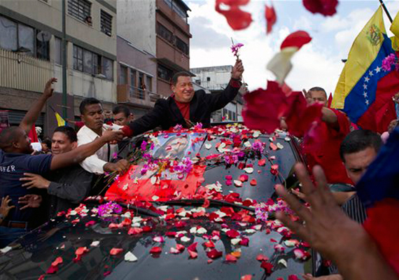 Chavez's black SUV left the palace and rolled slowly through the capital, with red-shirted bodyguards clinging to the running boards. His head and shoulders sticking out of the sunroof, the firebrand president waved to onlookers lining the avenues and people flying Venezuelan flags from rooftops.