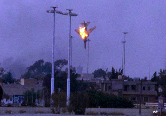 Gaddafi's ceasefire was in tatters this morning after a fighter jet was shot down in flames by rebels over Benghazi. Video footage showed the jet, believed to be a MIG, circling over the city before flames burst out of its engine and it hurtled to the ground.