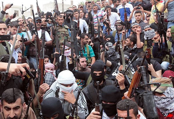 Gunmen shouting “Down with Bashar!” roamed the streets ahead of the funeral procession, which drew thousands of people who fired their rifles in the air as a sign of mourning.