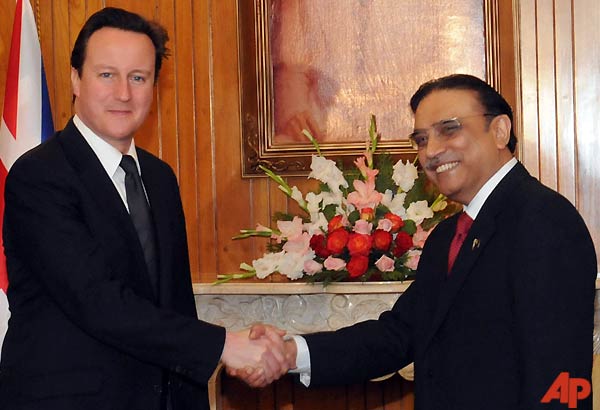 During the meeting with Zardari, Cameron discussed issues of bilateral cooperation, the Pakistan-Britain strategic dialogue, the fight against militancy, regional issues, trade access to EU markets for Pakistani goods, collaboration in trade and investment and education.