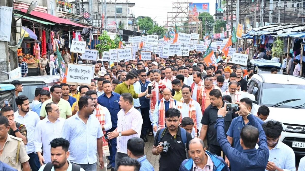 Assam Minister Pijush Hazarika, along with BJP workers, held a large protest rally in Jagiroad on Tuesday, demanding an apology from Congress leader and Karnataka Minister Priyank Kharge for his comments regarding Assam's semiconductor project.