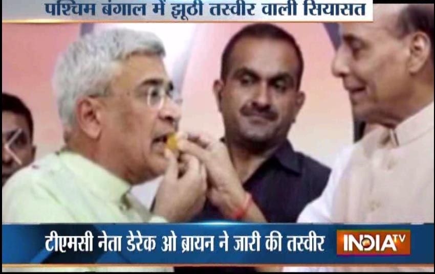 The photo was actually an old one of Rajnath Singh feeding ladoos to PM Modi at the BJP office. But in the photo released by the TMC, Modi had been replaced by Prakash Karat!