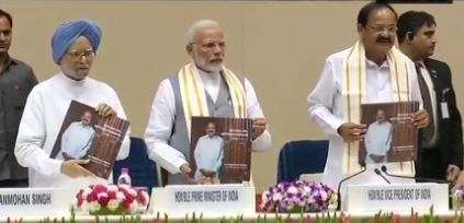 Prime Minister Narendra Modi on Sunday released Vice President Venkaiah Naidu's book “Moving On… Moving Forward: A Year in Office”. On the occasion, former PM Manmohan Singh was also present.