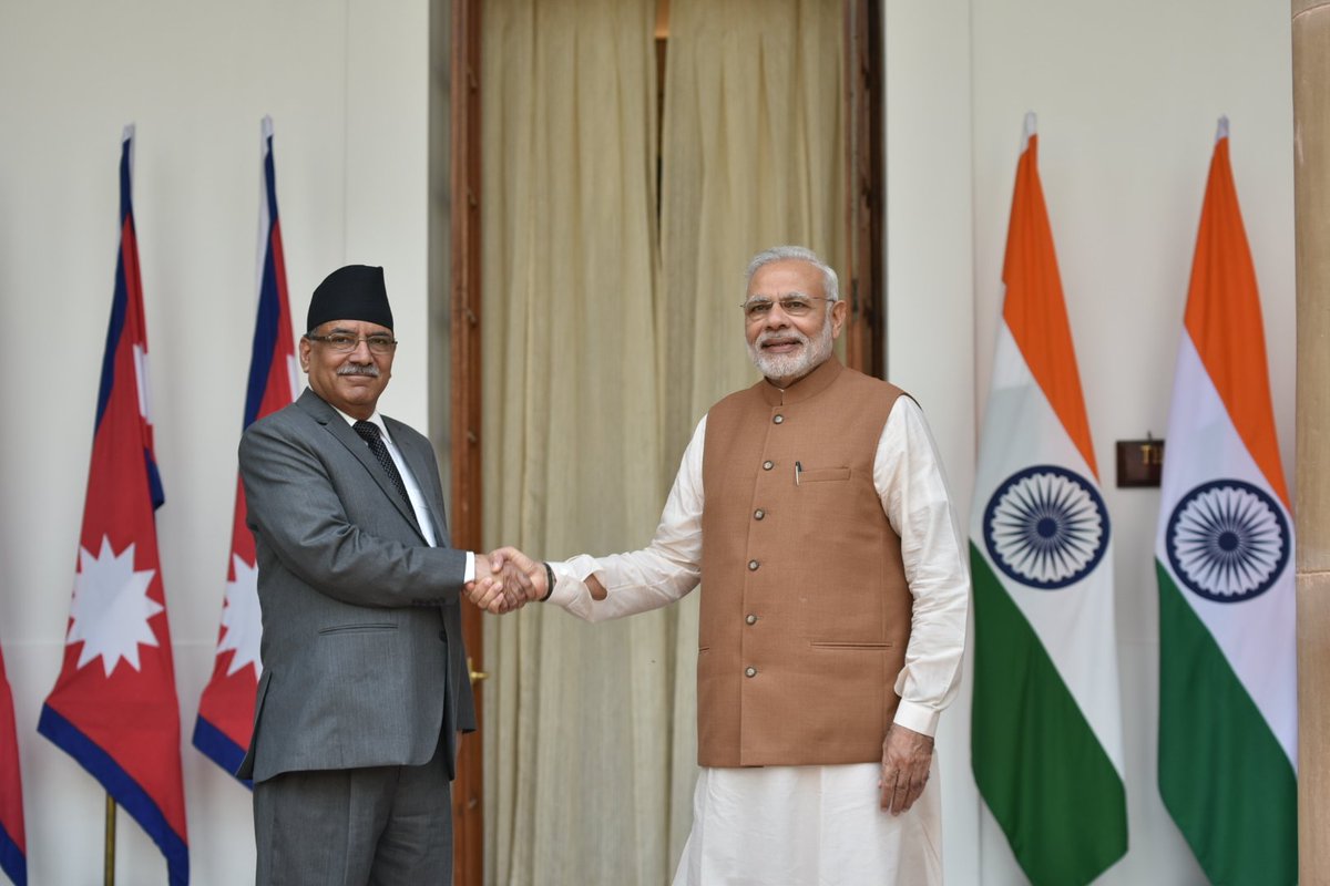 "Infusing fresh energy into a special relationship. PM @narendramodi receives Nepal PM Pushpa Kamal Dahal Prachanda," Swarup tweeted, along with a picture of the leaders shaking hands.