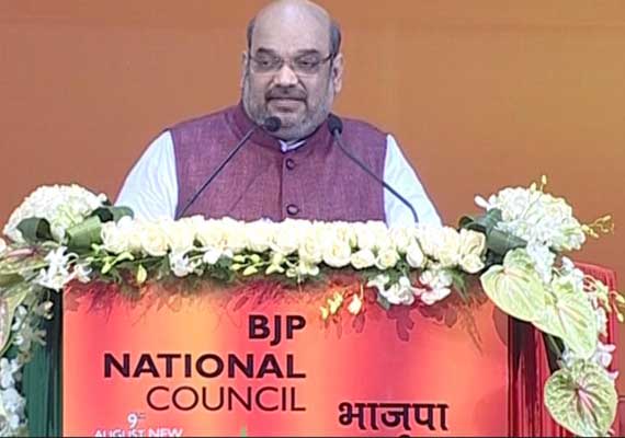 New Delhi: Ratified by the National Council as President, BJP chief Amit Shah today sought fresh milestones of victory by seeking victory in coming elections in all four states saying the country was still not “Congress-free” while Prime Minister Narendra Modi accused Congress and others of playing vote-bank politics.