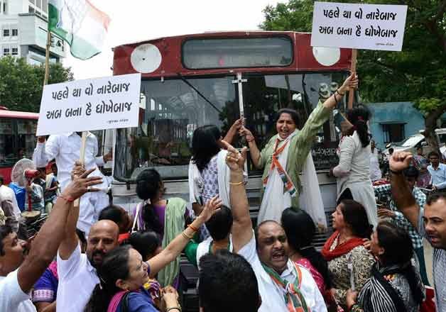 Congress leaders and workers led by city unit president Chetan Raval, gathered at Lal Darwaja area here and set afire the effigy of Prime Minister Narendra Modi as part of the protest.