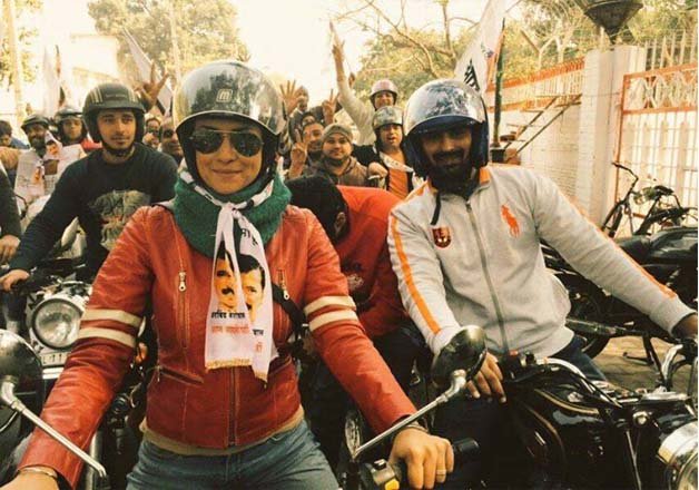 New Delhi: Bollywood actress, former Miss India and now Aam Aadmi Party worker Gul Panag campaigned for her party today riding a bullet in Krishna Nagar's Geeta colony.
