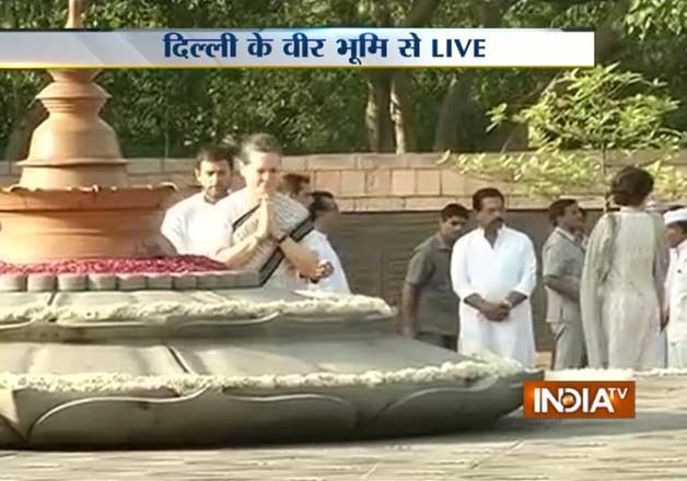 The late leader's wife and Congress president Sonia Gandhi accompanied by son and party vice-president Rahul Gandhi, daughter Priyanka Gandhi and son-in-law Robert Vadra offered flowers at his memorial 'Vir Bhumi' here.