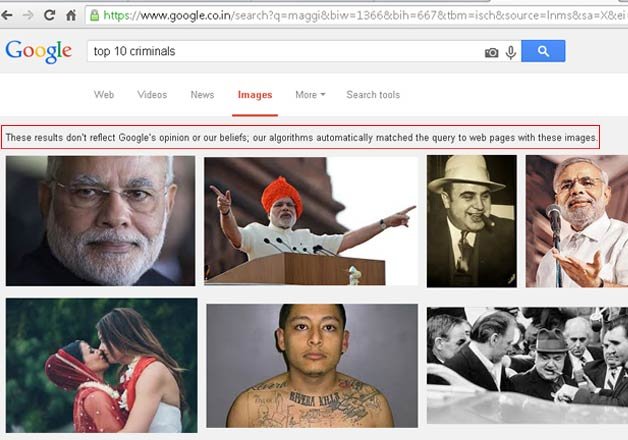 A disclaimer by Google also appears when ‘top 10 criminals is typed in Google image search, “These results don't reflect Google's opinion or our beliefs; our algorithms automatically matched the query to web pages with these images.”