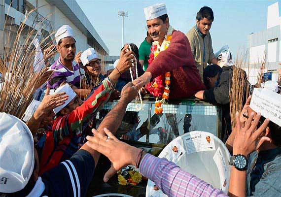After holding a road show in Dharuhera, Kejriwal reached Rewari where they were accorded a warm reception by party activists.