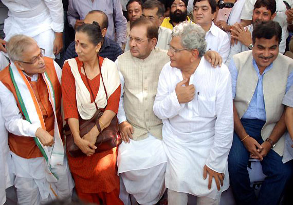 While Left leaders A B Bardhan and Sitaram Yechury shared the stage with BJP's Murli Manohar Joshi and Nitin Gadkari at a protest organised by traders, Samajwadi Party chief Mulayam Singh Yadav and TDP president N Chandrababu Naidu kept away from it but appeared at a Left protest rally and courted arrest along with others.