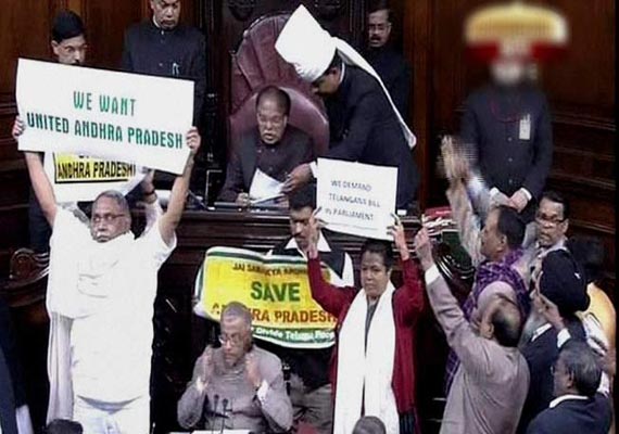 Seemandhra members belonging to the Telugu Desam Party (TDP) raised slogans of 'Save Andhra Pradesh, Save Democracy' near the chairman's podium during the debate on the bill.