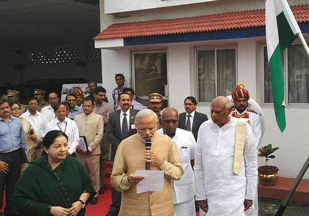 Flanked by Governor K Rosaiah and Chief Minister J Jayalalithaa, Modi began his brief statement with a sentence in Tamil saying telling people of Tamil Nadu, “I will be in support of you”.