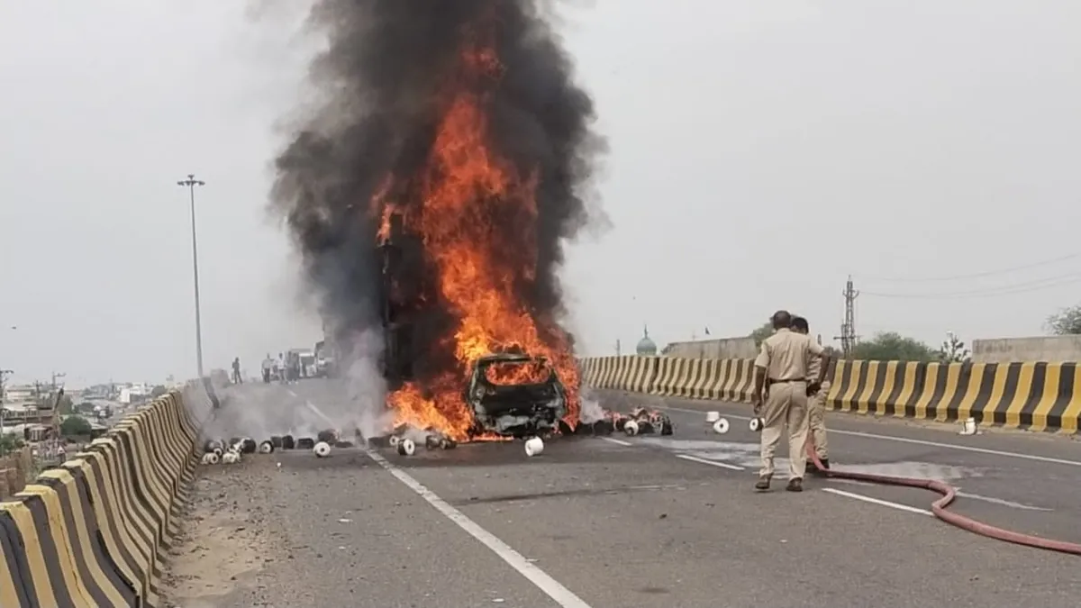 A speeding car collided with a truck on the Churu-Salasar Highway. After the accident, the car and truck caught fire. Six people traveling in the car were burnt alive in the fire. The accident happened at 2:30 pm on Sunday in Fatehpur, Sikar.