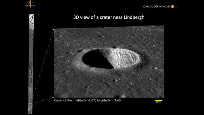 Chandrayaan-2's Terrain Mapping Camera has captured a three-dimensional (3D) view of a crater on the Moon. The imaged 3D view was posted by the Indian Space Research Organisation (ISRO) on Wednesday. The TMC-2 imaged the crater near Lindbergh. Terrain Mapping Camera-2 (TMC-2) is a follow-on of the TMC on-board Chandrayaan-1. TMC-2 provides images (0.4μm to 0.85μm) at 5m spatial resolution & stereo triplets (fore, nadir and aft views) from a 100 km orbit for preparing Digital Elevation model (DEM) of the complete lunar surface.