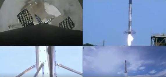 The video divides the screen into four separate camera angles focussing on the rocket from its entry into the atmosphere all the way till the touchdown.