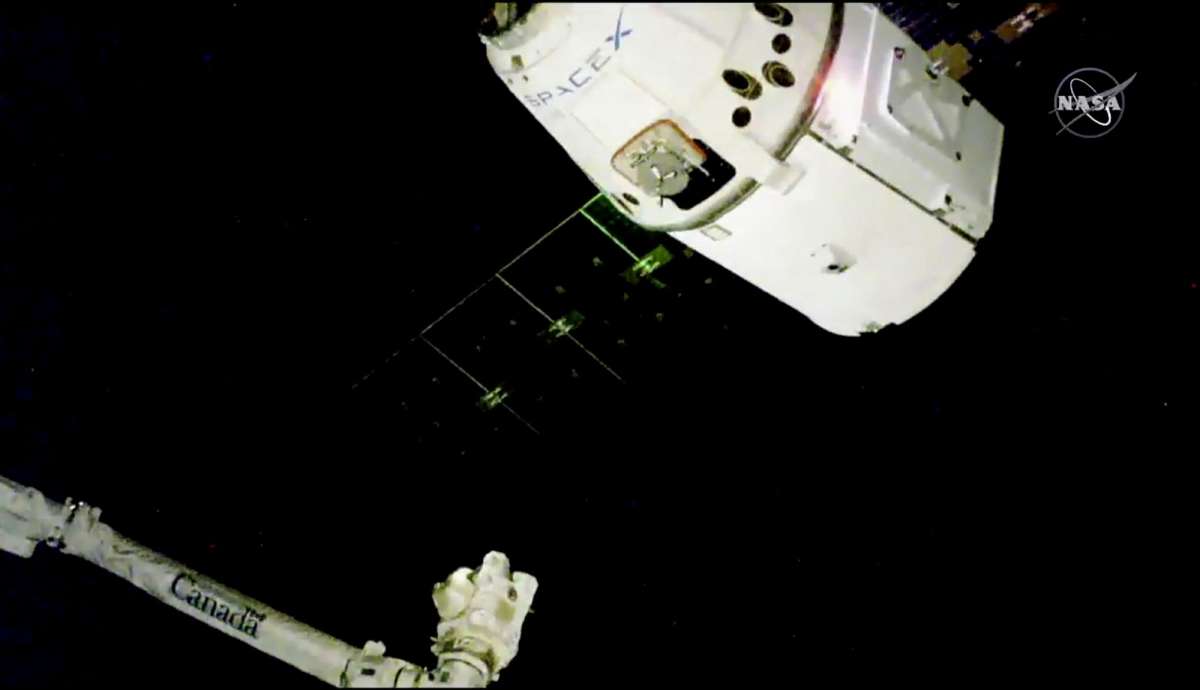 The Dragon capsule pulled up at the orbiting lab three days after launching from Cape Canaveral. Commander Alexander Gerst used the space station’s big robotic arm to grab the cargo carrier, as the two craft soared 250 miles above the Pacific.